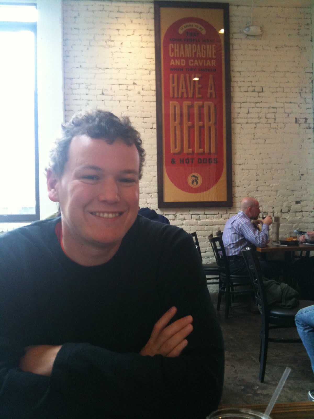 Kurt at Frank's (sign behind him says, "It seems to me that some people want champagne and caviar when they should have a beer and hot dogs.")